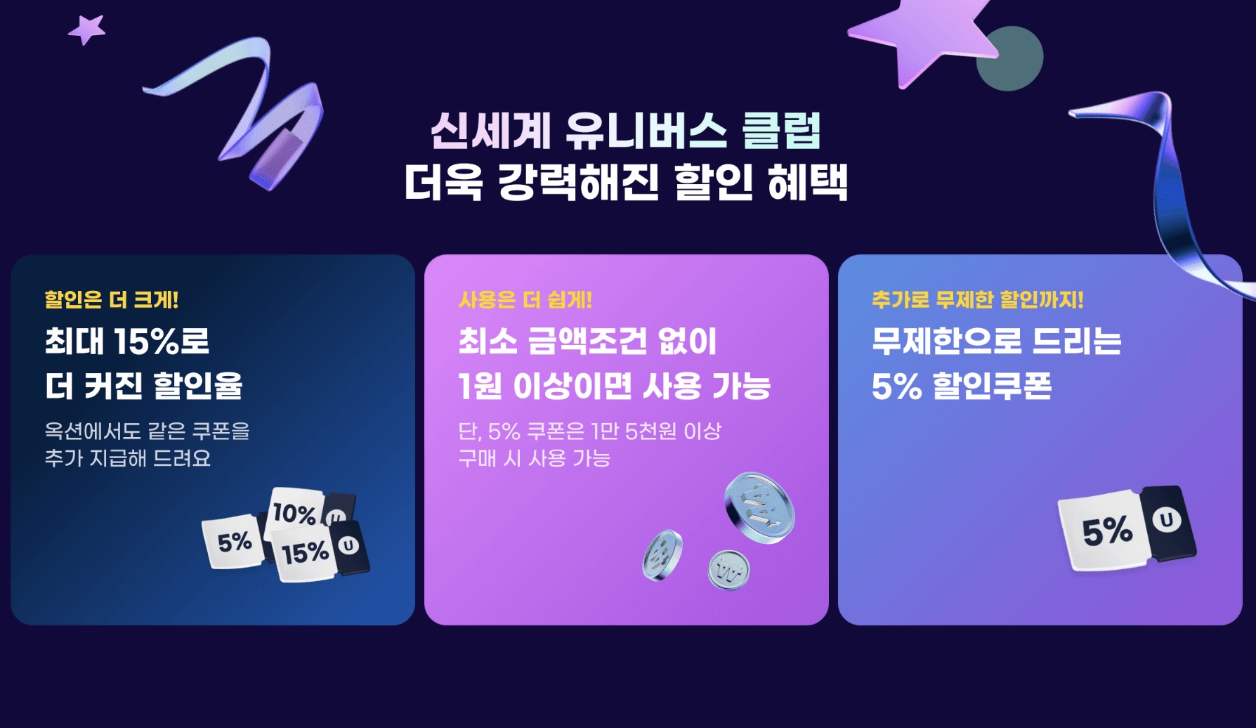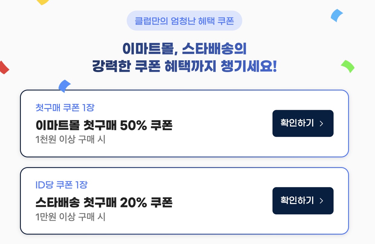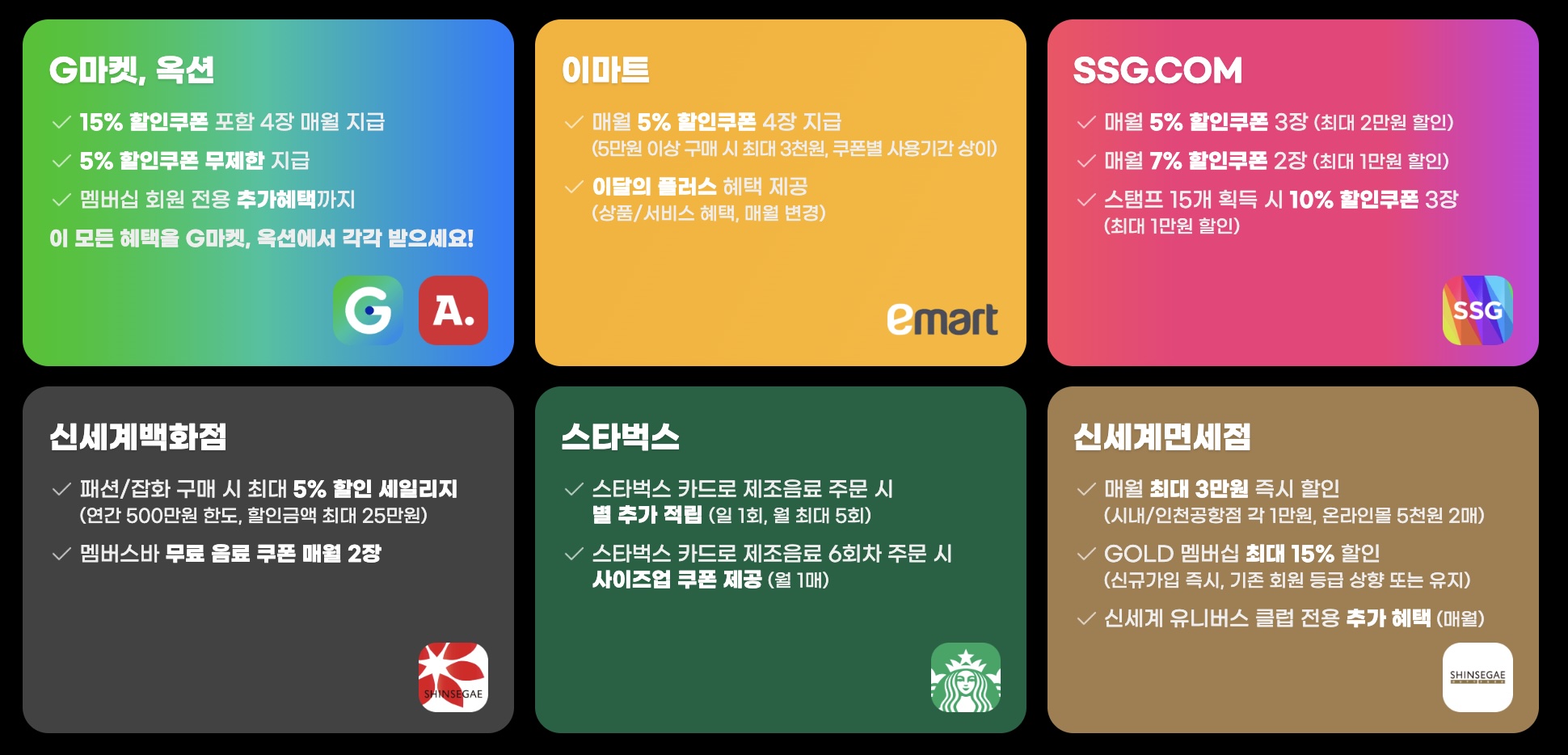 - SSG.com: 매달 최대 8만 원 할인 혜택 + 구매 스탬프 15개 달성 시 10% 쿠폰