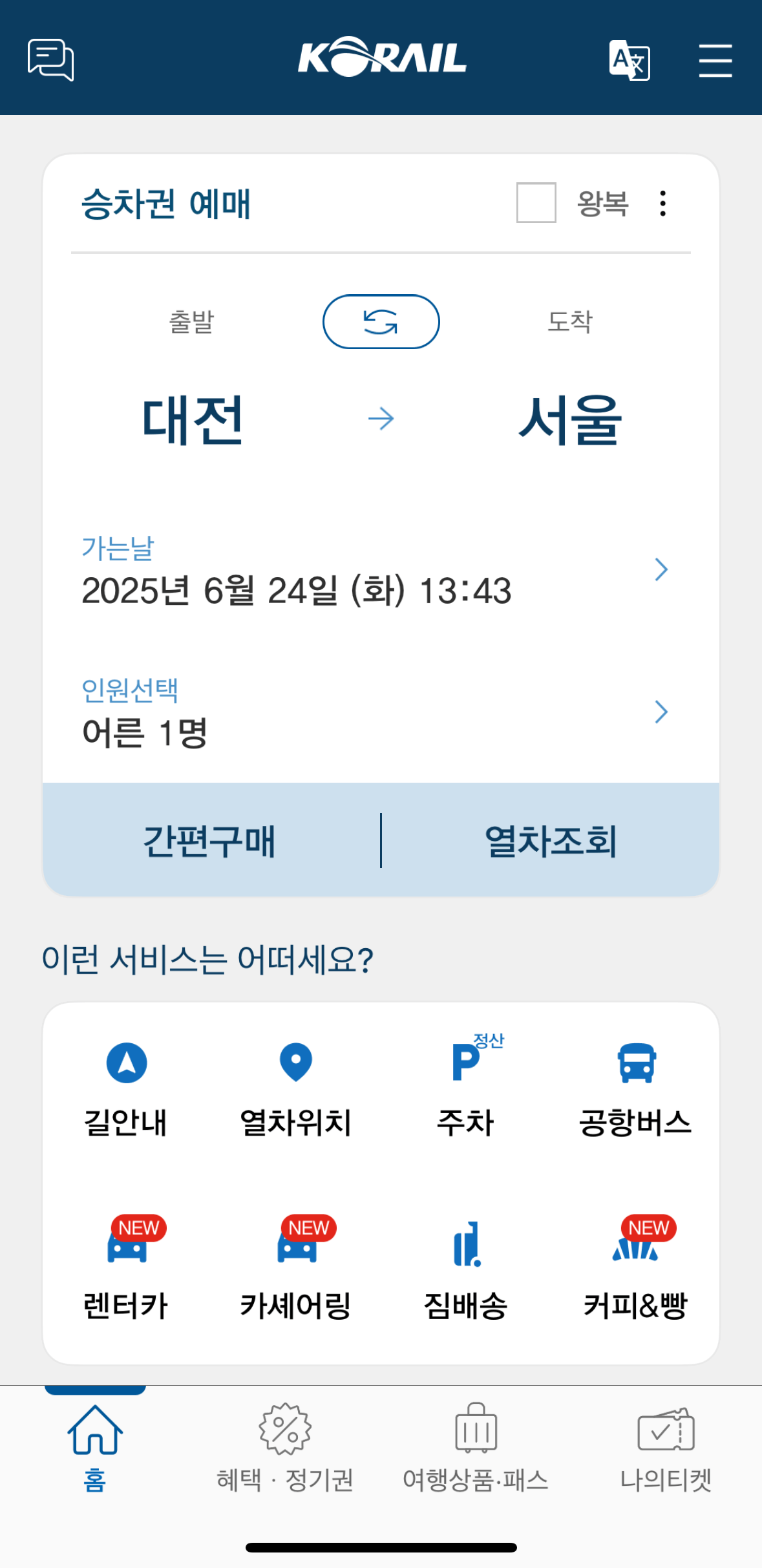 - 코레일 > 승차권 > 할인상품 메뉴 확인!